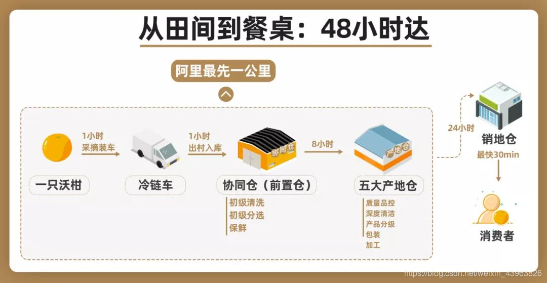 截止目前,阿里巴巴数农团队已经和1000多个农产品基地直接合作,并且在这些农产品基地建设了10个数字化的产地仓。再借助菜鸟的网络,实现落地配,无论是下沉市场的乡镇,还是一二线城市,都可以实现从采摘到运输3天直达消费者餐桌。